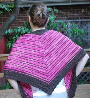 This shawl is the perfect thing when you want something a little more exciting than plain garter stitch (but not too much of a challenge) and something warm without having to commit to a whole sweater. Worked from the top down, beginning with a garter tab, this shawl features stripes incorporating short rows using wrap and turn (w&t). Because of the nature of garter stitch, however, wraps blend in easily and do not need to be picked up on subsequent rows. Because of the way the stripes alternate, it is easy to make the shawl larger or smaller to accommodate your yarn supply. The bottom edge of the shawl is finished with a picot bind off. You will need approximately 405 yards/370 meters of each of two different colors to complete this shawl. The pattern has been test knit and tech edited.