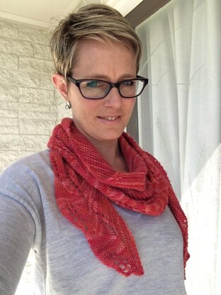This pretty scarf has a simple leafy lace edge that is reminiscent of the mountains and the trees in the area, and garter stitch for easy knitting in front of the telly or the fire on a cool night.