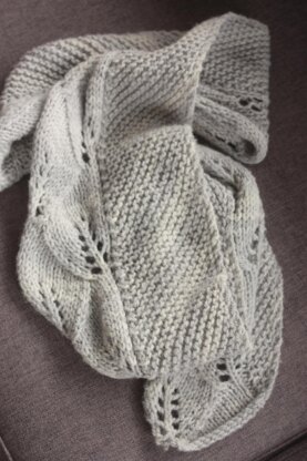 This pretty scarf has a simple leafy lace edge that is reminiscent of the mountains and the trees in the area, and garter stitch for easy knitting in front of the telly or the fire on a cool night.