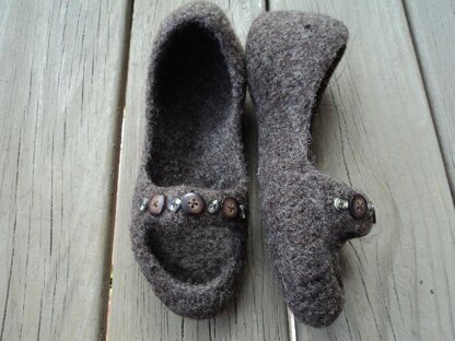 The slippers are knitted in the round as well as straight knitting and uses 100% wool worsted weight yarn, basic knit stitches, 24” or 29” circular needles. Skill level, easy to moderate, short row knitting involved. Machine washing for felting technique.