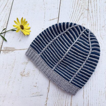 Lightweight hat featuring simple stitches and a fun swirling crown.