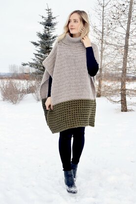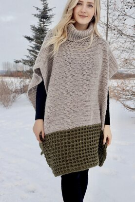The Pembina Poncho is a 2-tone poncho with a loose-fitting turtleneck. Colour-blocking is used to separate the textured waffle stitch bottom from the simple top section. This is a beginner-friendly layering pieces that uses double crochet and single crochet and variations of these stitches. This piece is worked in 3 pieces that get seamed at the shoulders at the end: 2 identical panels worked bottom-up, and 1 cowl.