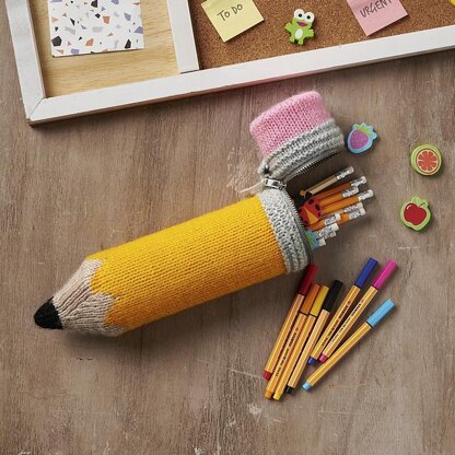This pencil shaped case can be used for storing pens and pencils, or knitting needles and hooks. The case has a zipped closure around the top, and is lined with knitted fabric. Plastic canvas grids cut to shape are used to line the pencil to keep its shape. Designed by Amanda Berry @fluffandfuzz, the case is knitted in acrylic DK yarns on single pointed needles (not in the round). For confident beginners and above, other techniques used include casting on and off, knits, purls, decreases, stranded colour-work, and seaming to finish.