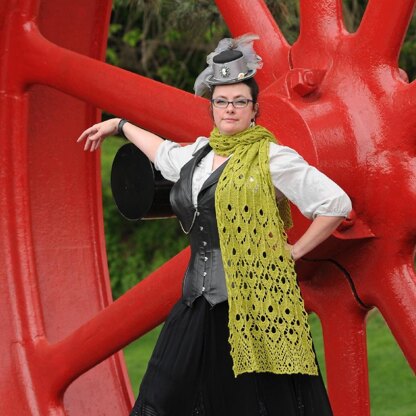 This stole is worked in two halves beginning in the center with a provisional cast on. A series of dramatic pendula extend towards the edges, culminating in an explosion of lace.