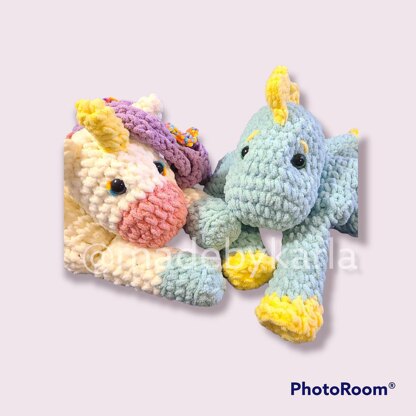 Penelope the Unicorn and Pj the Dinosaur keep children's pajamas in a cute plush toy that looks great on their bed. They are also great play companions and cuddle buddies. They are excellent for gifting children's clothing.