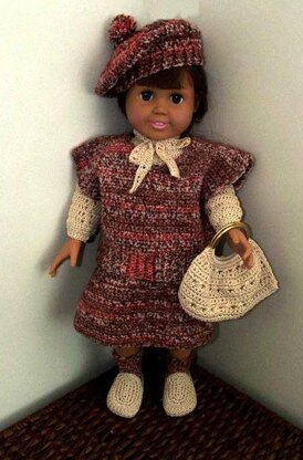 Pattern instructions includes skirt, vest, socks, beret, blouse, shoes and purse for 18" doll.
