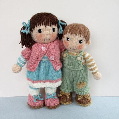 These cute little dolls are named Penny and Patch. Penny measures 30cm (12in) and her brother Patch measures 26cm (10in). Penny wears a pretty pink cardigan with short sleeves and a skirt. Patch wears dungarees. These clothes have buttons and can be removed for washing. The dolls' shoes are permanently fixed. The buttons on the clothing can be omitted if the dolls are to be given to a baby and safety is an issue. If you omit the buttons then the clothes will need to be stitched in place. The little dolls are designed to stand unaided. I hope you have fun knitting them.