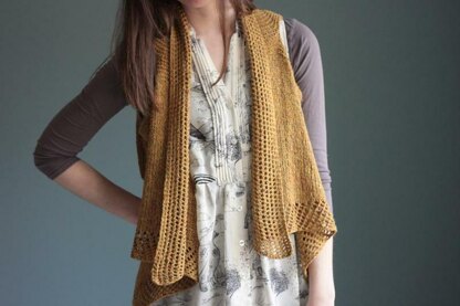 Penny is a seamless vest that is knit in one piece from side to side. The pattern is written for 5 different yarn weights: fingering, sport, dk/light worsted, worsted/aran, and bulky, so you can use whatever yarn you like (yardage required for each yarn weight is listed below). Simple, quick and versatile, Penny is a relaxing knit that will make a perfect light layering piece. Sample photographed is size small and uses 2 skeins of Knit One Crochet Too's Soie et Lin (a silk/linen blend) in the Cumin colorway. To acheive a similar drape, I recommend using a yarn with fiber content such as linen, cotton, silk, bamboo, cashmere, alpaca, etc.