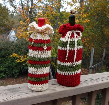 One PDF with crochet instructions for attractive wine bottle gift bags in two size variations, color patterns, and tie options for wine bottle gift bags. It works up pretty quickly and is really fun to make. Shown in Christmas Holiday colors but you can enjoy creating your own color scheme for any occasion, holiday, decor, season, school or team colors. The reusable gift bag is a gift in itself in addition to whatever you put inside!