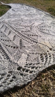 15 sts and 18 rows per 10cm gives a lightly blocked shawl that measures 160cm tip to tip and 60cm neck to hem at centre. To make a slightly larger shawl, adjust gauge by using a larger needle and/or heavier yarn. You can also make a much larger version by repeating rows 47-83 (repeating these rows adds 4 extra border repeats, approx 20cm to depth neck-to-hem and approx 60cm to length tip-to-tip).
