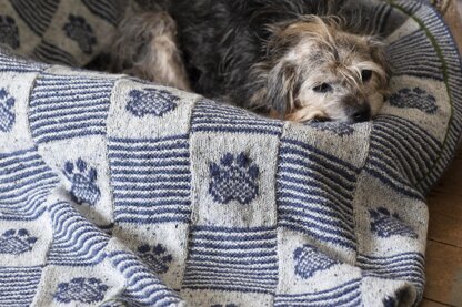 A cute Fairisle blanket for your dog or as a gift for a dog-lover. Knitted in two colours of Rowan Felted Tweed DK with a third colour as a narrw edging to the border. It is made up of two alternating squares: a striiped garter stitch one and one in stocking stitch with a Fairisle paw print motif.