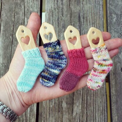 Skill level: advanced beginner Finished dimensions: approximately 2-inch sock Suggested Yarn: fingering weight yarn, sock yarn. 2G, 7-10 y/m Needles: size 000 circular needle (1.5 mm) Gauge: 10 st and 13 rows = 1 inch in stockinette