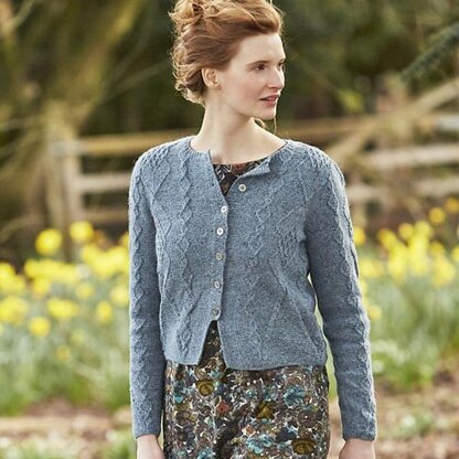 PETAL is a very flattering shape, semi fitted and square with an unusual button stolling. The stitch is mainly a twisted stitch pattern with a small section of shaped garter stitch at the bottom.