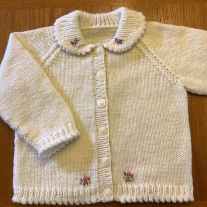 A dainty jecket for a little girl, adorned by rosebuds. The larger size used Paintbox Yarns Simply DK, the smaller size used Stylecraft Life DK. Both sizes used 2 x 100 gram balls of yarn. If another yarn is selected it is suggested, e.g. a wool or cotton, it is suggested the yardage should be compared carefully.