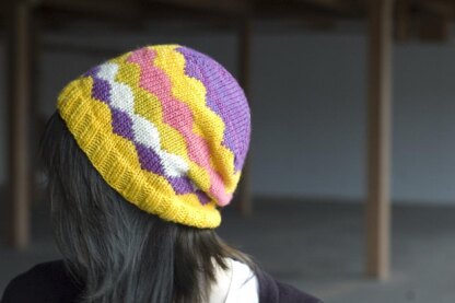 “Pétoncle" is the French word for scallop, something this hat has in abundance! (Albeit not the seafood kind, hehe.) Each scallop row is spaced further from the last for a sort of “slow fade." Bright colors give it a cheery, harlequin-esque appearance, but this hat is ripe for experimentation- try changing the spacing or color combinations for a totally different look! Instructions for two sizes are provided- the smaller is suitable for older children and small-headed adults; the larger will be better for most other adults. (Keep in mind that, given the colorwork rows, this hat isn’t quite as stretchy as most.)