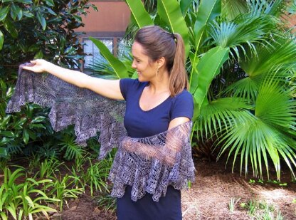 Phemonoe is a generous, spiral-shaped wrap. Initially worked in repeating, nested crescents to achieve the length, it is finished with a lacy border worked in rows along outside edge.