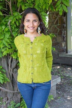 The perfect cardigan for autumn in the park. Leafy lace on the front panels are worked side to side.