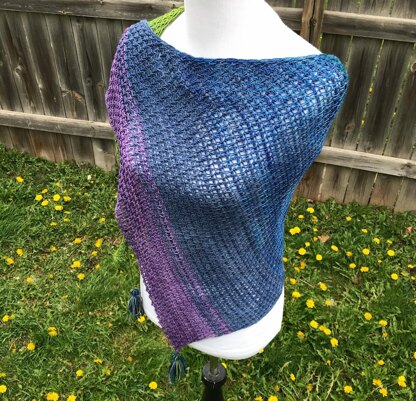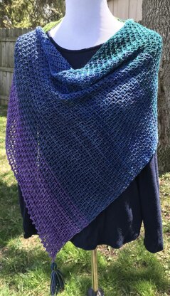 It is an asymmetric triangle worked in Tunisian crochet. It begins with a short end that builds into a triangle with an increase worked at the end of each row. It is a color block stripe with each new color introduced within a few rows of transitioning to that next color. Tassels can be made with leftover yarn. This is an intermediate pattern.