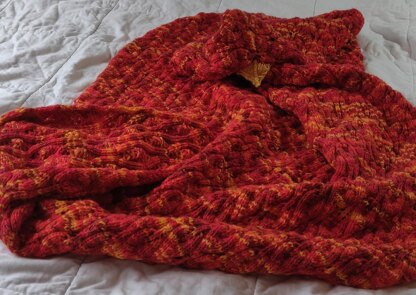 With a built-in hood and stretchy texture, this blanket is super comfy for the little bird in your life. The cascade of fiery feathers flow from the yellow beak all the way down. Knit diagonally, the blanket is diamond shaped and implies wings and a tail.