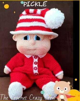 We would like to introduce to you 'Pickle' and I'm sure you will agree he is a little Pickle! He is made up of basic stitches and rounds and the entire pattern is worked in DK Yarn, he stands at approximately 17" tall , but may turn out bigger if you were to use different yarns, the pattern includes the following:-