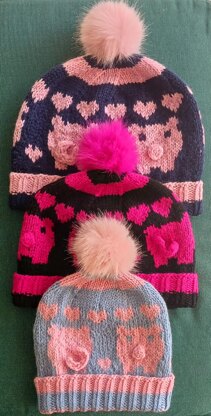 A seamless bobble hat knitted using Fair Isle and colorwork techniques, the hat shows pigs - all with sticky-out snouts, except for one who is one cheekily showing off his curly tail! ;-)