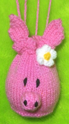 This knitting pattern is for a drawstring gift bag in the shape of a pig's face.