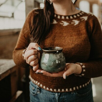 This boxy top down jumper is knitted in the round and features a seamless construction and colourwork yoke. It comes in ten adult sizes with customization options for body length, sleeve length, and bust shaping.