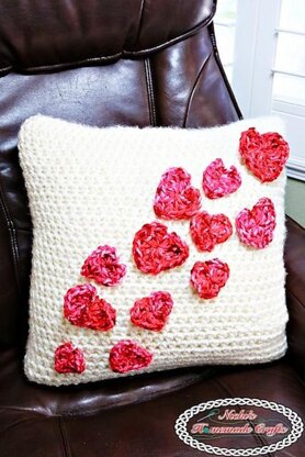 This Pillow Case with Flying Hearts is super unique as it is made without sewing or slip stitching (besides the hearts).