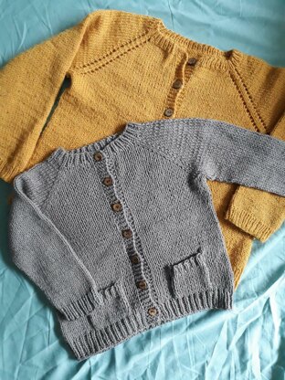 It’s a minimalistic cardigan which comes in a huge variety of sizes. It’s designed for boys and girls, knitted seamlessly top down in stockinette stitch; button plackets and buttonholes are worked as you go. You start at the neck, work increases along the raglan seams (optional you can highlight the raglan seam with some decorative knitted eyelets), put your sleeve stitches on hold and finish the body, including the set-in pockets. Pick up again the sleeve stitches and finish your sleeves in the round. That’s it! It’s a very simple, beginner-friendly piece of knitting. This is the dk weight version of the Pilo cardigan, it’s only variated in the yarn and gauge and it has additional little pockets.