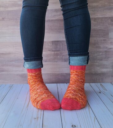 This pattern includes three sizes: Small (Medium, Large) fitting a 7-8” (9”, 10-11”) in foot circumference and (10-11", 11-12", 12-13") heel circumference with a 1” gauge of 8 sts/11 rows.