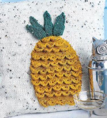 This is a pattern for a pineapple cushion cover, originally published in Lets Knit. It has a stocking stitch base with a simple intarsia motif on the front. Lengths of lace are added to the pineapple to form the texture, and leaf motifs are added to the top. the edges are in moss stitch with a button fastening. Photos Lets Knit.
