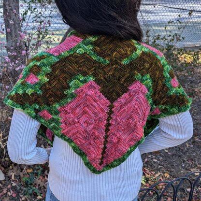This shawl is built from mitered squares of different sizes. Specific instructions for each type of square are listed first, followed by the overall instructions for the shawl. Use the chart on the last page to determine the correct placement of each square.