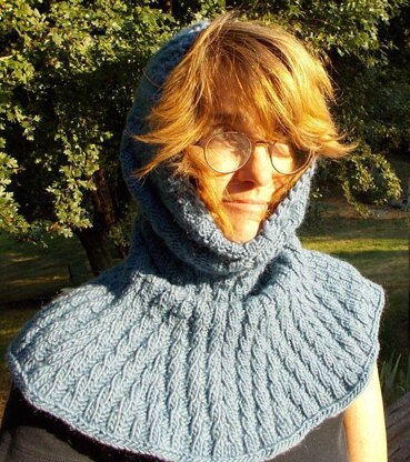 This cowl can be worn pulled up over one’s ears or folded up around one’s neck, while the lower edge flares out over the shoulders.