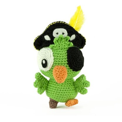 Materials Crochet needle (2,5 mm) Green yarn (for instance Phildar Phil Coton 3 - Pomme 85) Orange yarn (for instance Phildar Phil Coton 3 - Melon 70) Brown yarn (for instance Phildar Phil Coton 3 - Praline 79) White yarn (for instance Phildar Phil Coton 3 - Blanc 10) Black yarn (for instance Phildar Phil Coton 3 - Noir 67) Yellow yarn (for instance Phildar Phil Coton 3 - Citron 63) Fiber fill Black and white felt Yellow feather