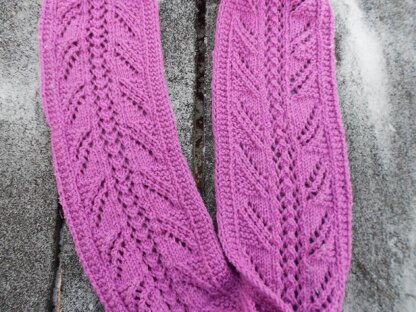 Cuddle up in this enchanted neck warmer knitted in a luscious color! This long loop can be wrapped around twice to give added warmth! The lacy pattern features simple to knit textured lace on the sides which border a central strip of lace. It is an easy to learn pattern which repeats quickly. You may make this shorter or longer or knit with a finer yarn or a chunky yarn to make it your own fashion statement!