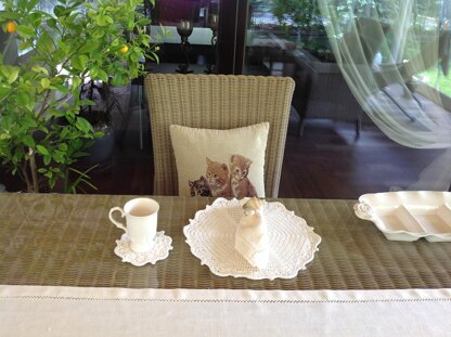 Measurement of the placemat will be around 13”/33 cm and the coaster will be around 4,5" /12 cm in diameter. Size 3/DK/Light worsted weight yarn is used on this design.