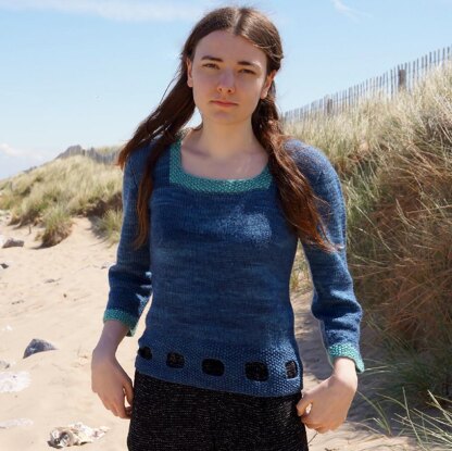 This is a super, easy-wearing sweater with three-quarter length sleeves and a flattering square neckline.