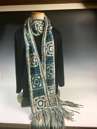 It has been relaunched here in my Ravelry Shop using US terminology. This pattern is fun to crochet and provides lots of interest as you go along. It starts by crocheting motifs. Those motifs are then connected, using a pretty puff stitch insertion pattern. The scarf is then edged and fringed. The length of the scarf can be adjusted by making less motifs.