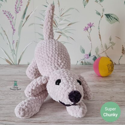 I've made Playing Puppy using a super chunky #6 weight plush yarn. This is ideal for a big soft and huggable toy and is a pretty quick make. He is 11 inches long (when made with recommended materials).