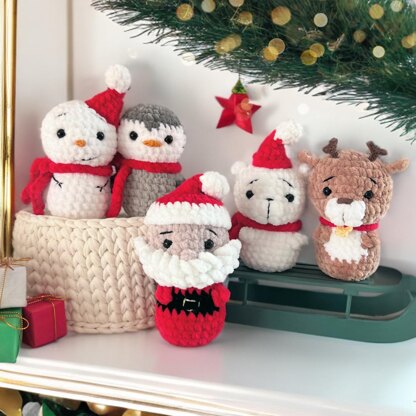 This crochet pattern consists of 5 toys - Santa, a penguin, a deer, a snowman, a beer