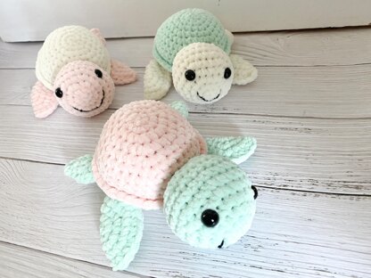 I created this pattern after seeing an advertisement online about saving and protecting turtles. This turtle can be made and created in just over an hour. The yarn needed to created this turtle can produce up to 3 turtles in those colours.