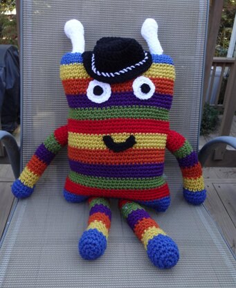 Adorable stuffed plushie inspired by my Monster Friend plushie pattern - a variation on the same theme. He’s about 15” tall not including his legs, hat or antennae, and a little over 11” across (about 22.5” measured around the middle) - a perfect toy or pillow. The pattern is fun and not too difficult. A great gift and you can change up the colors as desired to match holiday themes, sports teams, déco, personal preference.