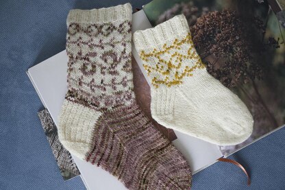 These socks are worked in the round, from the cuff to the toe. The pattern includes a written description and charts, video tutorial, recommendations for washing and blocking the finished product.