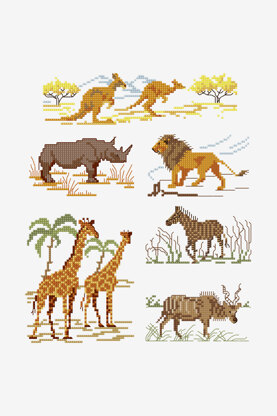 Time to take your stitches on a safari! This free cross stitch design features a range of majestic animals, including kangaroos, lions, giraffes and more. Perfect for tote bags, t-shirts and cushion covers - this pattern will add that special touch to your next handmade project. For beginner cross stitchers, check out our guide on how to cross stitch!