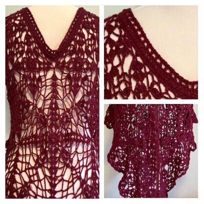 A modern seamless lace crochet motif pattern by contemporary artist Kristen Stein. This romantic, flowy, Art-Deco inspired garment measures 43” long from shoulder to pointed hem. It can easily be worn as a long tunic, or as an overlay dress or fancy bathing suit coverup. The piece is shorter on the sides with a slight flare, it then comes to a long point in the front and back. The top is tank top style. The piece was made with 3 skeins of #1 yarn. It’s very lightweight and easy to wear. It is designed as a one-size-fits most pattern with recommendations provided to alter size if desired.
