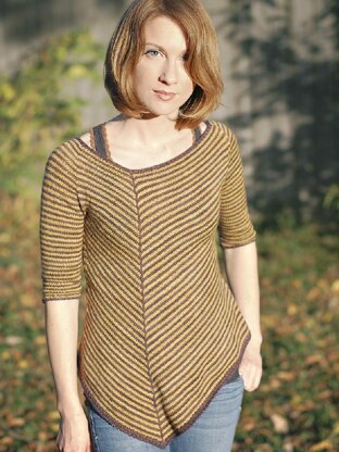 A striped, asymmetrical tee with contrasting ribbed borders and a slipped stitch detail. This sweater has a hi-lo, straight back and an a-line, chevron pointed front.