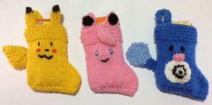 This knitting pattern is for three christmas stocking tree decorations as Pikachu, Jigglypuff and Poliwag from Pokemon inspired characters.