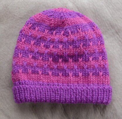 This quick knit 12ply beanie has a 1x1 rib turned up brim then is worked in an easy striped, slip stitch pattern.