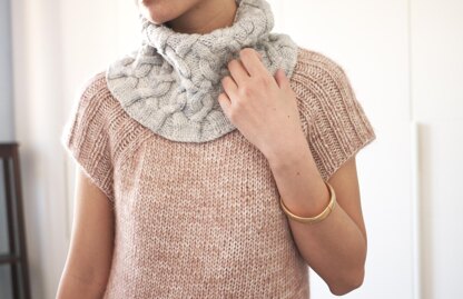 Polonaise is a cozy cabled cowl. The slightly flared bottom edge sits nicely around the collar to keep chill out. Three sizes are give:; it can either be worked as a single-skein project or as an extravagant double loop cowl.