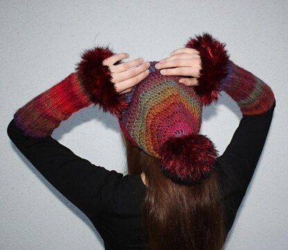 Den Bommel habe ich nicht aus Wolle gewickelt, sondern aus dem Flauschgarn gestrickt. Er sieht fast aus, wie aus Kaninchenfell, ist um einiges billiger und das Garn kann auch als Abschluss der Stulpen verwendet werden.